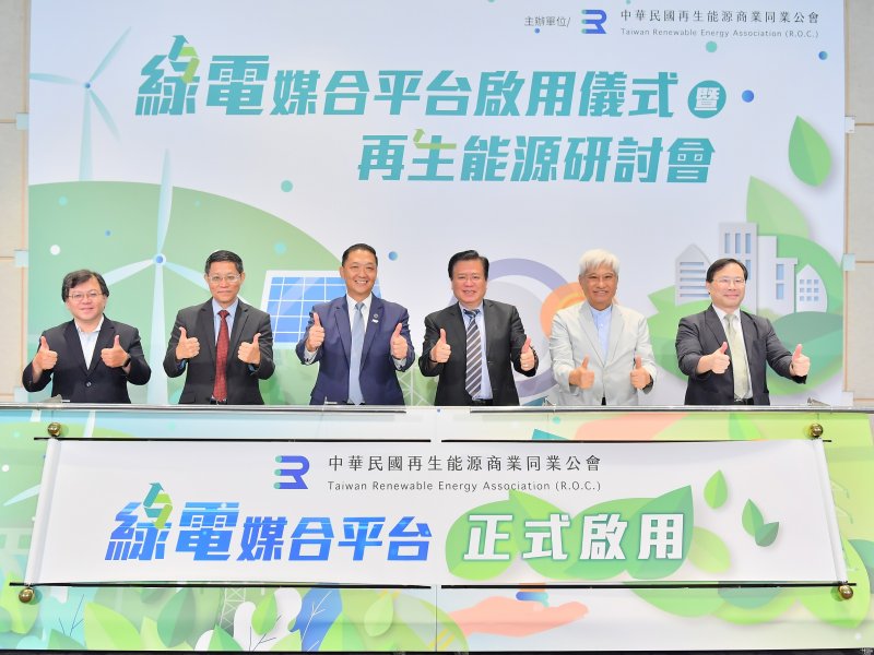 「綠電媒合平台」的啟用儀式,由再生能源公會理事長胡惠森偕經濟部能源署夏峪泉組長、標準檢驗局黃志文組長及國內用電主力企業所屬的三大公會代表,中華民國全國商業總會理事長許舒博、中華民國全國工業總會副理事長陳進財、台灣區電機電子工業同業公會秘書長林全能等人,共同見證啟動儀式,讓台灣未來再生能源電力市場發展及企業擴大使用綠電有平台可以服務。