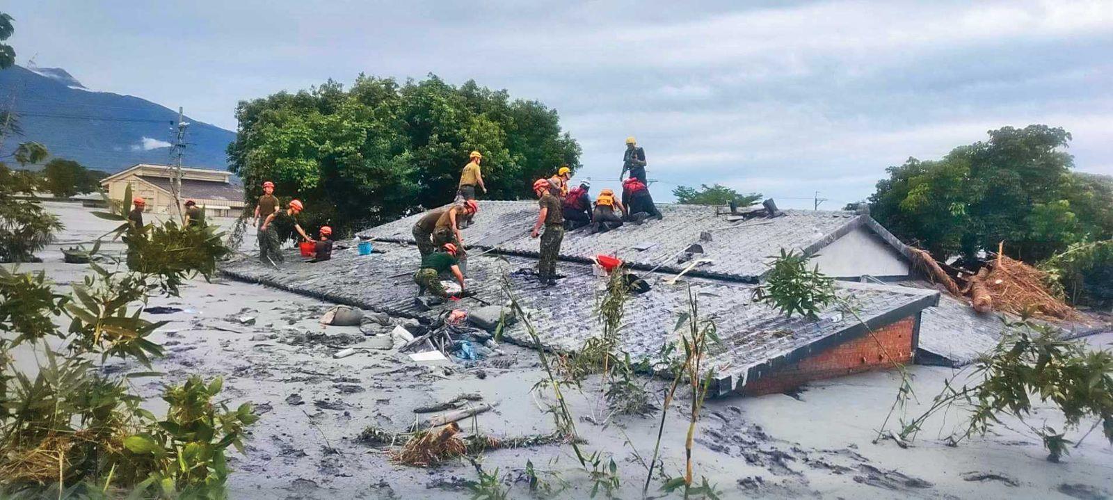 黑色土石泥流淹沒民宅,只剩屋頂可見,淤積厚度近3公尺。(圖/翻攝花蓮縣政府臉書)