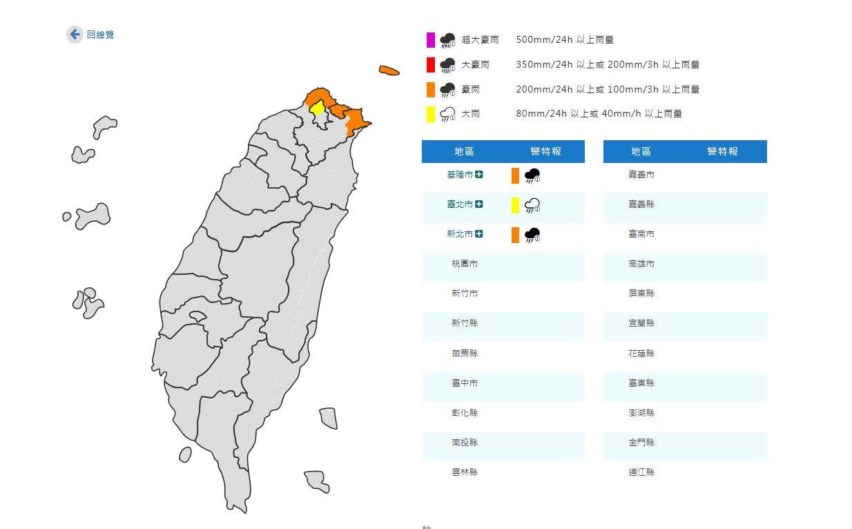 中央氣象署今(4)日19時50分,針對3縣市發布豪、大雨特報,提醒民眾留意雨勢。中央氣象署表示,受東北季風影響,基隆北海岸有局部大雨或豪雨發生的機率,臺北市山區有局部大雨發生的機率,請注意瞬間大雨、雷擊及強陣風。