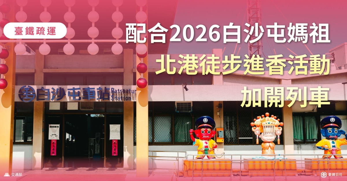 臺鐵公司配合「白沙屯拱天宮媽祖北港徒步進香活動」,將於115年4月11、12、13、18、19、20日(6天)加開區間(快)車160列次;4月11、12、18、19、20日(5天)共25列次莒光號增停白沙屯站、加掛215列次,海線運能較平日增加108.7%,以疏運活動日人潮,歡迎民眾多加利用。